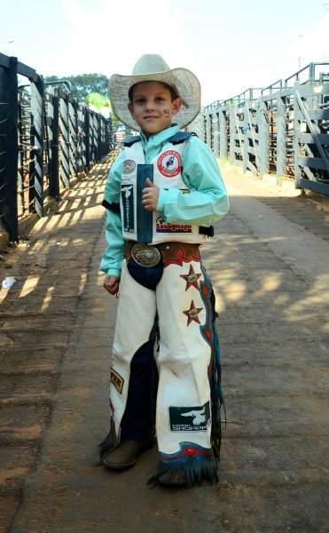 Gabriel Pita, 8 anos, de Barretos/SP, é bicampeão do rodeio em carneiros da 61ª Festa do Peão de Boiadeiro de Barretos. A competição reúne crianças com peso de até 22 quilos. O vencedor ganhou um par de botas, chapéu, camisa e skate. “Foi muito bom ser bicampeão”, disse. “Quero ser igual meu pai e um dia montar em touro”, frisou.
