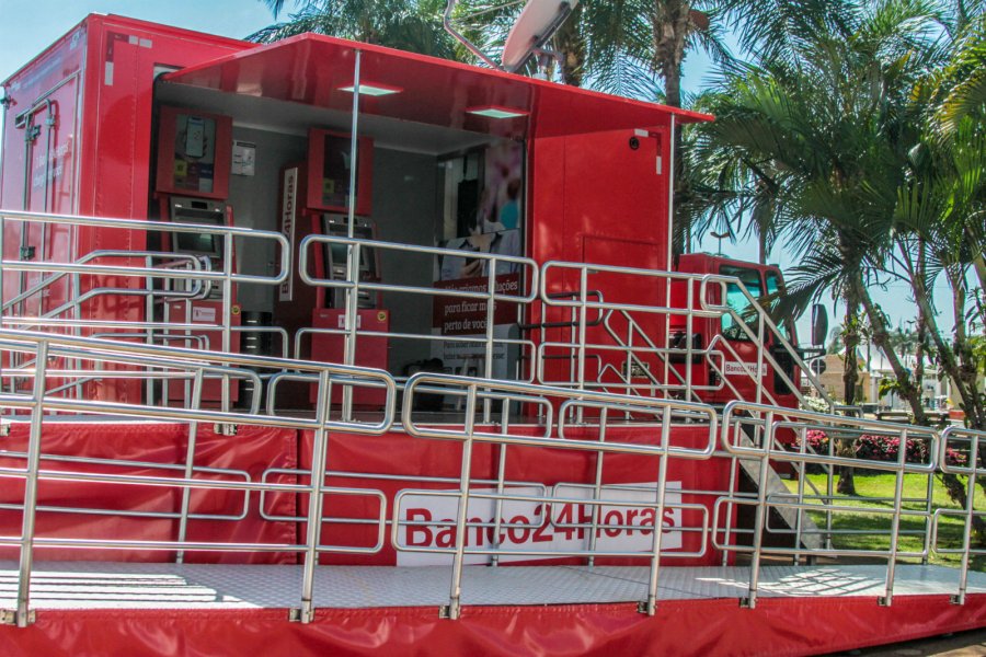 Os caixas estão instalados em caminhões adaptados que contam com gerador de energia e dispositivos que garantem a segurança dos equipamentos.