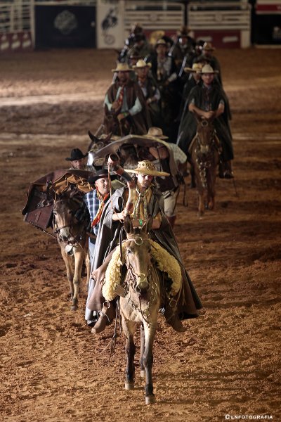Com os refletores apagados, mulas, burros e carro puxado por bois entraram no recinto simbolizando os antigos meios de transporte do campo. Segurando lamparinas, vários tropeiros da Comitiva “Água do Peão”, de São José do Rio Preto/SP, tocaram berrante e encenaram uma “Queima do Alho” nos tradicionais fogareiros à lenha.