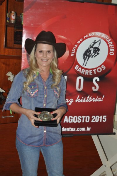 A amazona Fatiana Ferreira esteve no Parque do Peão na tarde desta sexta-feira, dia 27, para receber do presidente da Associação Os Independentes, Jerônimo Luiz Muzetti, a fivela de campeã da prova de Três Tambores do 22º Barretos International Rodeo.