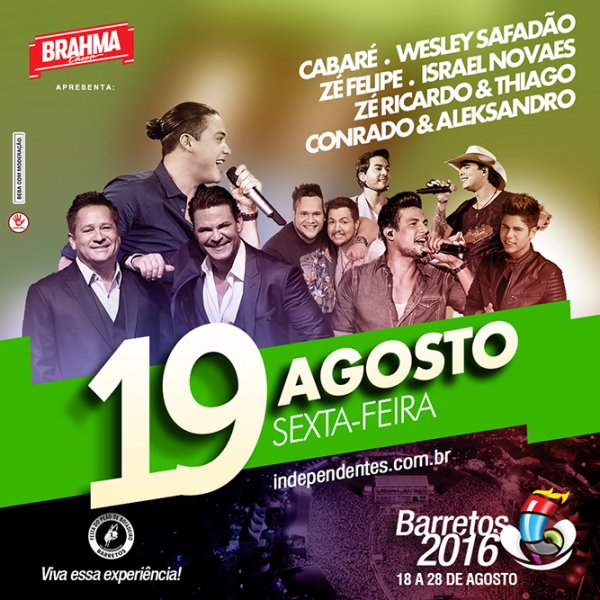 Na abertura do evento, dia 18, quinta-feira, a programação inclui as duplas Simone & Simaria e Jads & Jadson, além do especial Filhos da Terra. Na sexta-feira, dia 19 de agosto, mais grandes atrações: Cabaré – projeto especial de Leonardo e Eduardo Costa -, Wesley Safadão, Zé Felipe, Israel Novaes, Zé Ricardo & Thiago e Conrado & Alekssandro.